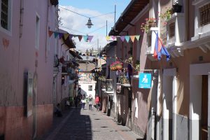 So blieben nur noch Kevin und ich übrig. Wir sind dann zur Iglesia de San Francisco gegangen und auch in die Kirche hinein. Kevin hat mit erzählt, dass er im dazugehörenden Convent früher mal zur Schule gegangen ist. Wir sind dann noch ein bisschen weiter durch die Straßen gelaufen, zur Calle de la Ronda. Das ist die älteste Straße Quitos, in der es kleine Handwerkerläden und Kunstausstellungen gibt und die abends ein beliebtes Ausgehviertel ist. Sie ist wirklich hübsch, eine enge gepflasterte Gasse mit bunten Häusern und quer darüber gespannten Wimpeln. In einem kleinen Eiscafé haben wir auch ein Eis gegessen. Danach haben wir uns noch auf eine Wiese gesetzt und ein bisschen geredet. Gegen fünf musste Kevin allerdings leider nach hause gehen, da in der nächsten Woche Klausurenwoche war und er noch lernen musste.
